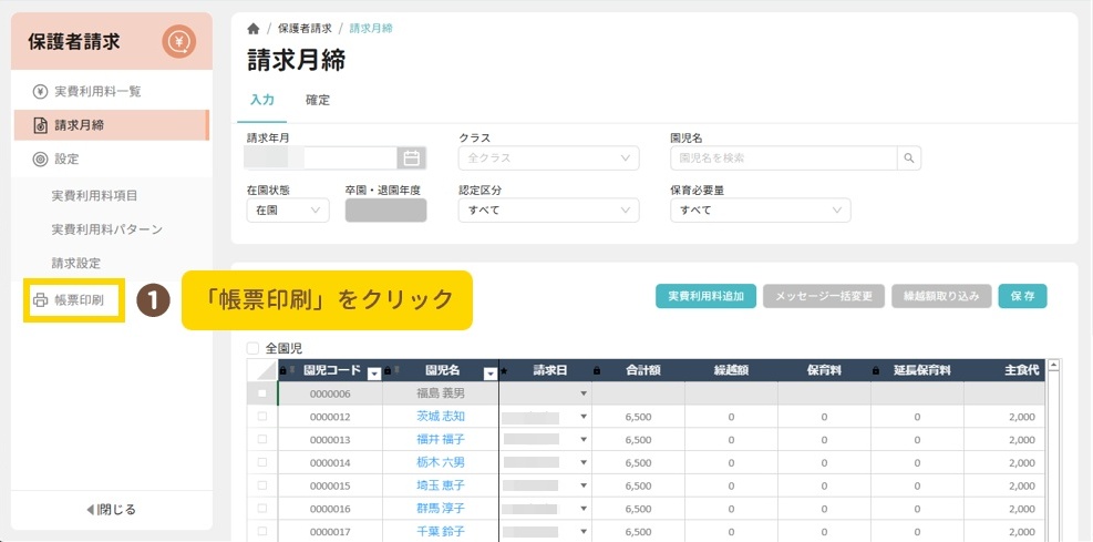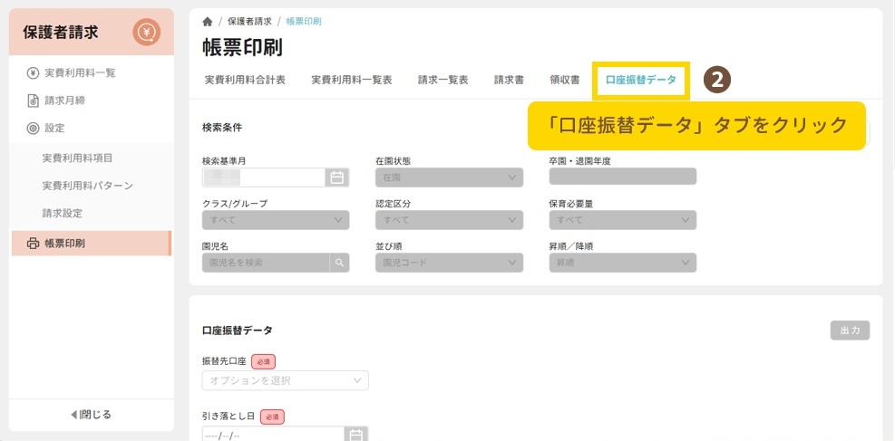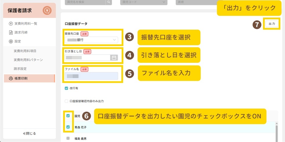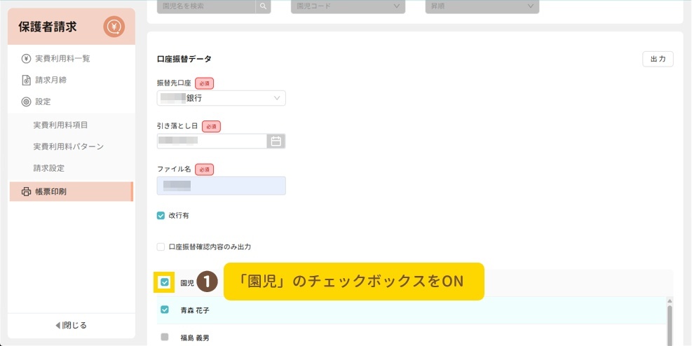 請求処理⑤:口座振替データを出力する 「帳票印刷」をクリックします。 「口座振替データ」タブをクリックします。 「振替先口座」を選択します。 「引き落とし日」を選択します。 口座振替データのファイル名を入力します。 口座振替データを出力したい園児のチェックボックスをONにします。 出力 をクリックして口座振替データをダウンロードします。 全園児の口座振替データ出力する場合 「園児」のチェックボックスをONにすることで、全園児のチェックボックスをONにすることができます。