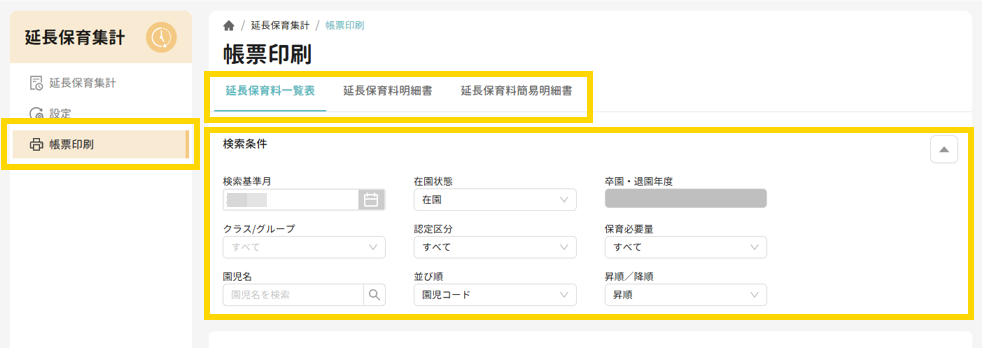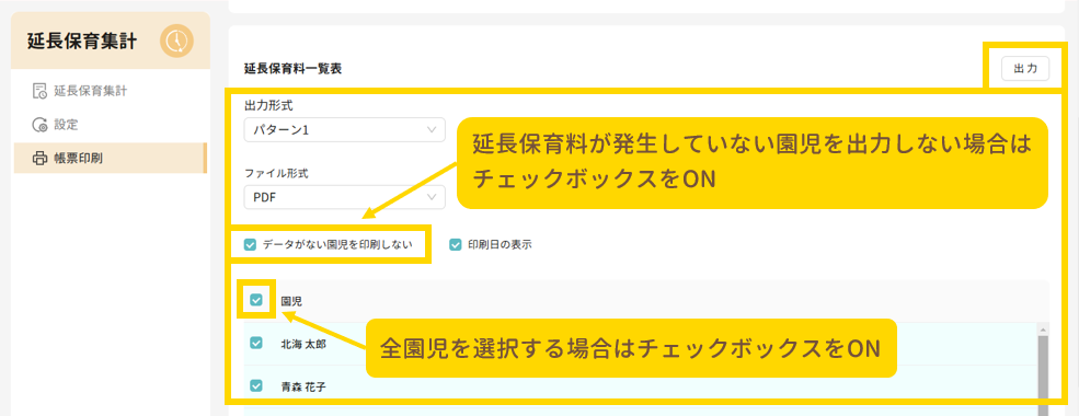 | データがない園児を印刷しない | 延長保育料が発生していない園児を出力しない場合、チェックボックスをONにします。 |