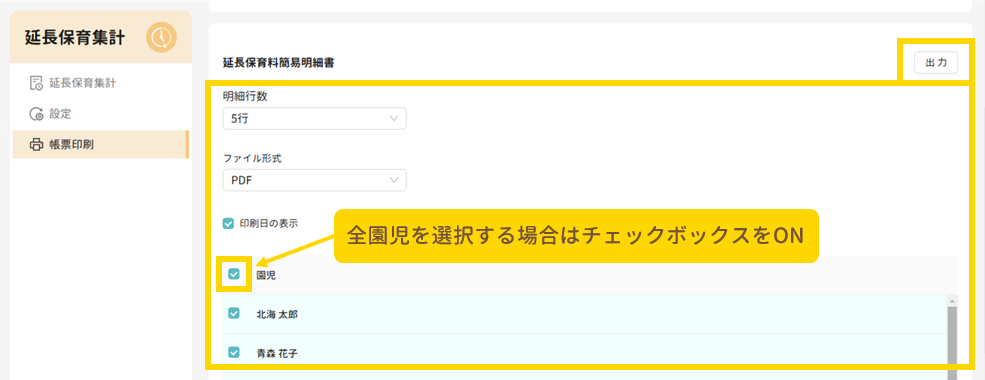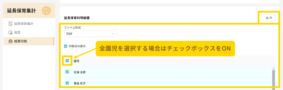 | 園児の選択 | 出力対象とする園児名左のチェックボックスをONにします。 全園児を出力対象とする場合は、先頭行の項目名「園児」左のチェックボックスをONにします。 |