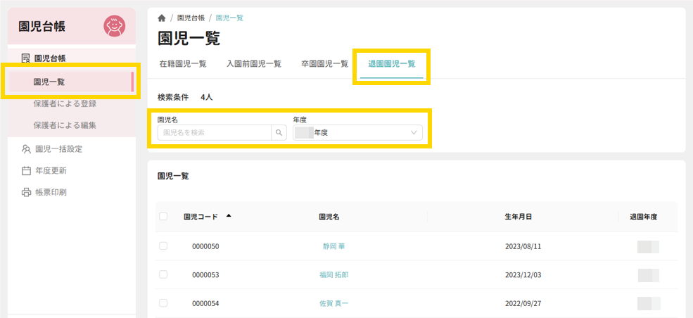 - 「退園園児一覧」タブをクリックします。