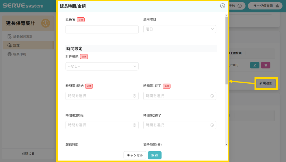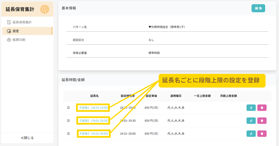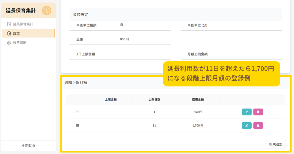 「延長時間/金額」で設定した延長保育料の組み合わせで上限金額を設定します。