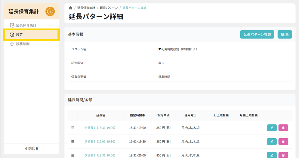 - 「延長パターン」で設定した延長パターンのパターン名をクリックし、延長パターン詳細画面を開きます。