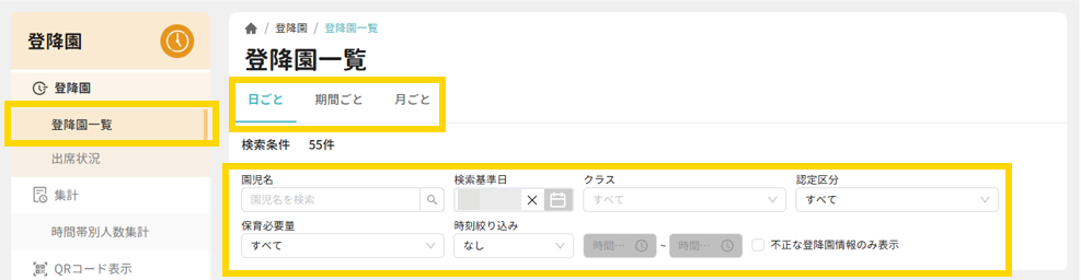 | 期間ごと | 設定した期間の園児の「登園」「降園」「出欠」を確認します。 |