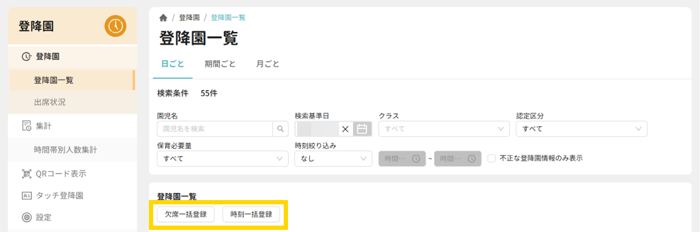 | 時刻一括登録 | チェックボックスがONになっている園児を一括で「登園」または「降園」登録します。 また、「出欠」が登録されていない園児を一括で「出席」にします。 |