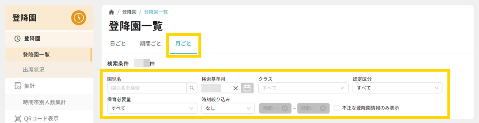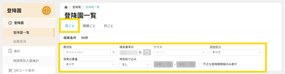 必要に応じて「時刻絞り込み」「不正な登降園情報のみ表示」を選択します。