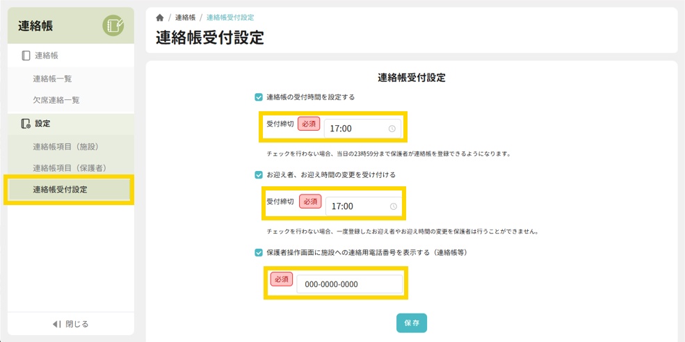 | 連絡帳の受付時間を設定する | 登園予定、連絡帳項目(保護者)で設定した内容を、保護者が送信できる時間を設定します。 |