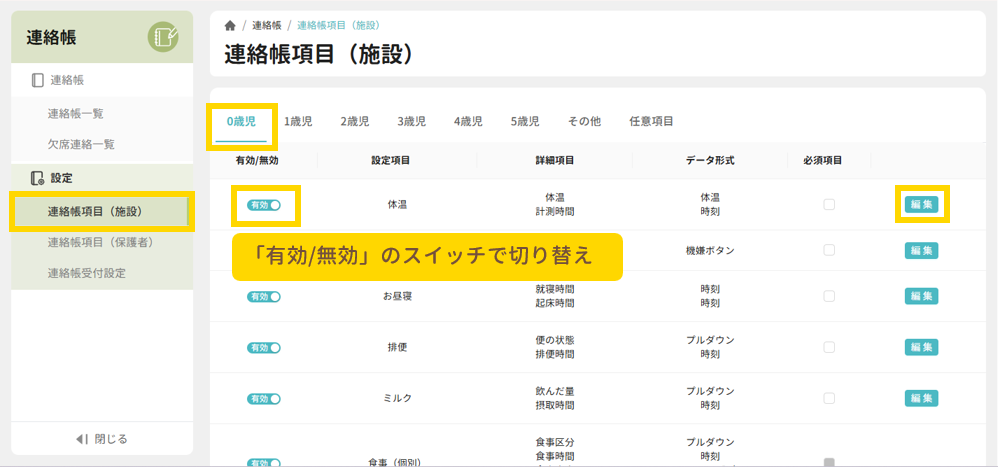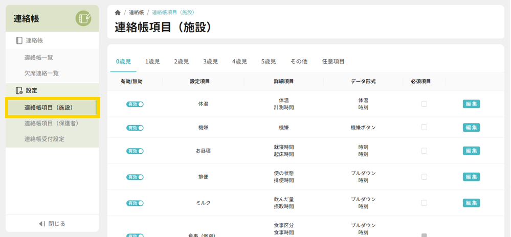 「0歳児」~「その他」タブの連絡帳項目を設定する