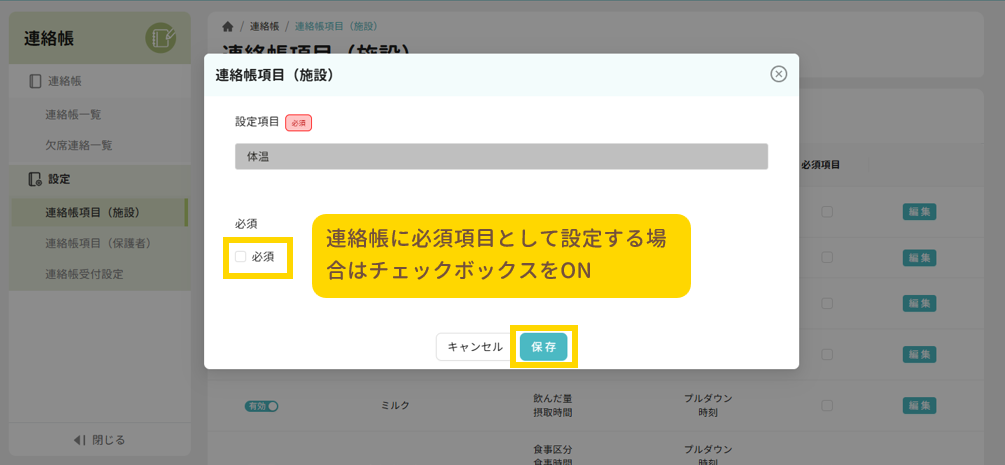 - 連絡帳に必須項目として設定する場合は「必須」のチェックボックスをONにします。