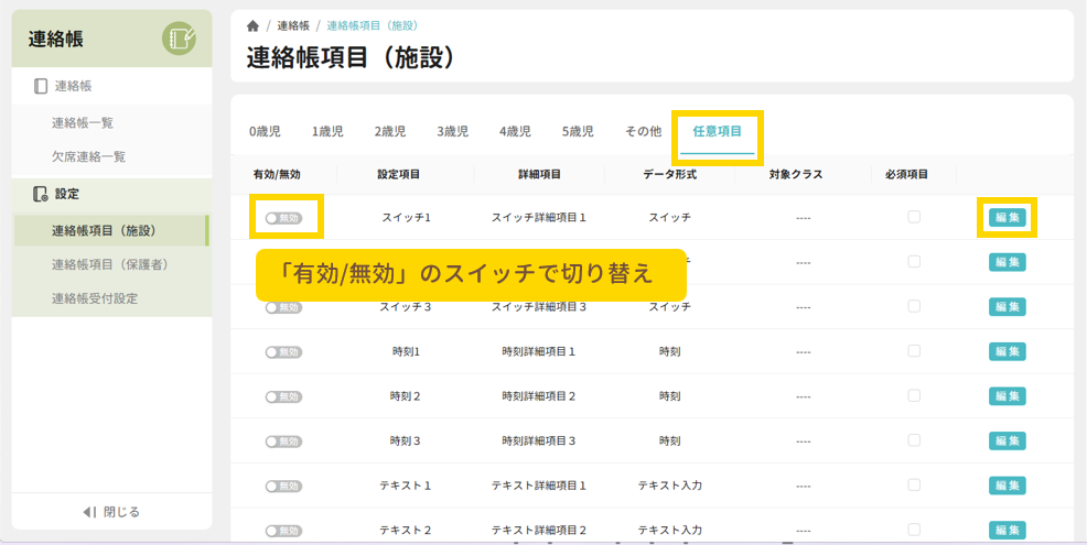 「有効/無効」のスイッチを切り替えると、連絡帳画面に即座に表示/非表示が反映します。