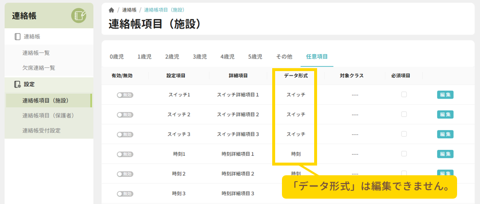 | 設定項目 | 連絡帳に表示する項目名です。 | ||||||||||||||
