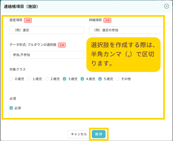 | 設定項目* | 連絡帳に表示する項目名を入力します。 | ||||||