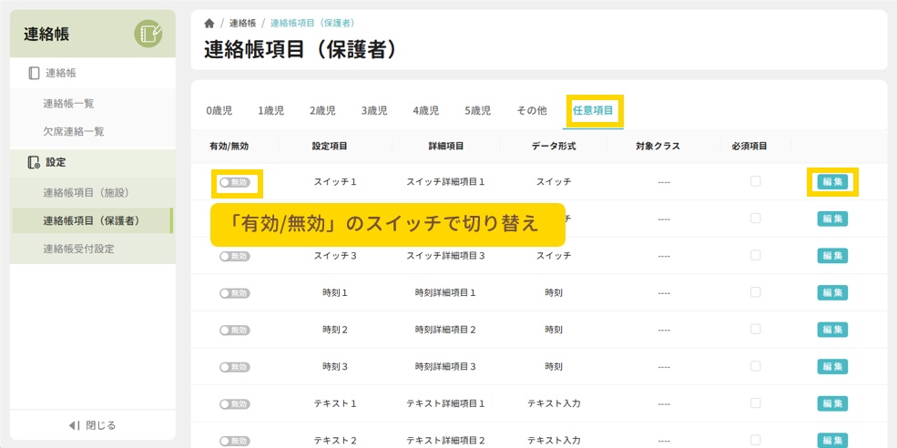 - 連絡帳に必須項目として設定する場合は 編集 ボタンをクリックします。