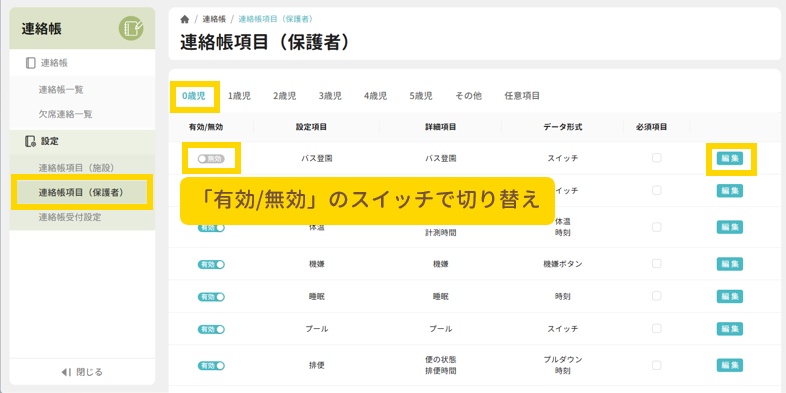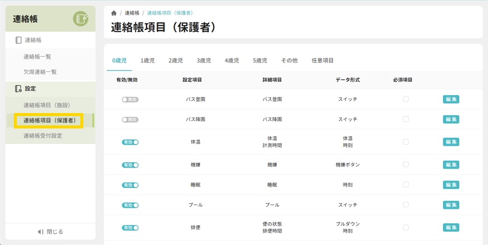 「0歳児」~「その他」タブの連絡帳項目を設定する