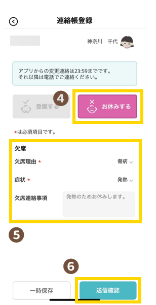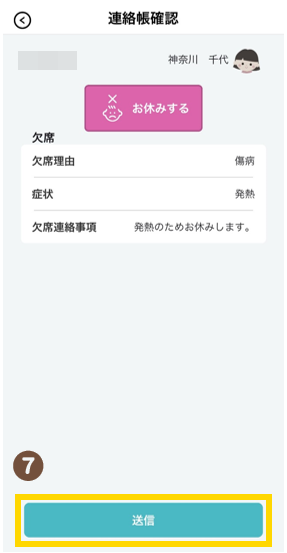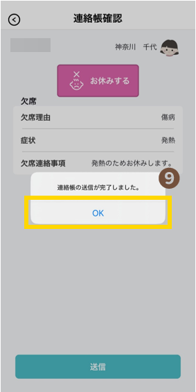 連絡帳を送信する(欠席する場合) ※欠席連絡は一ヶ月先まで送信が可能です。 「連絡帳」をタップします。 欠席する日付をタップします。欠席連絡は1ヶ月先まで登録が可能です。 + 連絡帳作成 をタップします。 お休みする をタップします。 「欠席理由」、「症状」を選択します。「欠席連絡事項」は施設へ伝えたいことがある場合に入力します。 送信確認 をタップします。 欠席理由について 「欠席理由」にて「傷病」 または 「出席停止」を選択した場合、「症状」の選択が必須となります。 内容を確認し、 送信 をタップします。 「連絡帳の送信」メッセージが表示されましたら、「OK」をタップします。 送信完了のメッセージが表示されましたら、「OK」をタップします。 送信した内容が表示されます。 確認 をタップします。