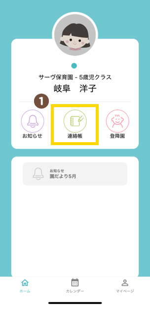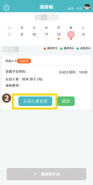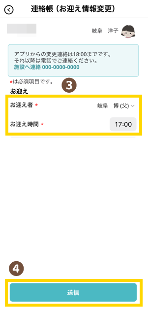 お迎え者、お迎え時間を変更する 「連絡帳」をタップします。 お迎え者変更 をタップします。 「お迎え者」、「お迎え時間」を必要に応じて変更します。 送信 をタップします。 「お迎え者」、「お迎え時間」が更新されたことを確認します。 「お迎え者」、「お迎え時間」の変更について 「お迎え者」、「お迎え時間」の変更は施設で設定されている受付締切時間を過ぎると変更できません。受付締切時間内に変更いただくか、受付締締切時間後は施設にご連絡ください。